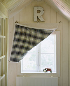 A detail of a country bedroom, wood panelling, a quilted piece of check fabric clipped back at window, toy tractor, radiator,