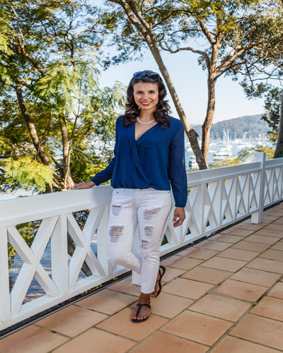 Dress Temple Ninie wrap shirt, $29.95, with Dress Temple Ninie white boyfriend ripped jeans, $69.95, and R.M.Williams Millie sandals, $300. Model wears Sportsgirl Frost sunglasses, $39.95, and Australian Pearl Divers Pure Pearl strand necklace, $1275.
